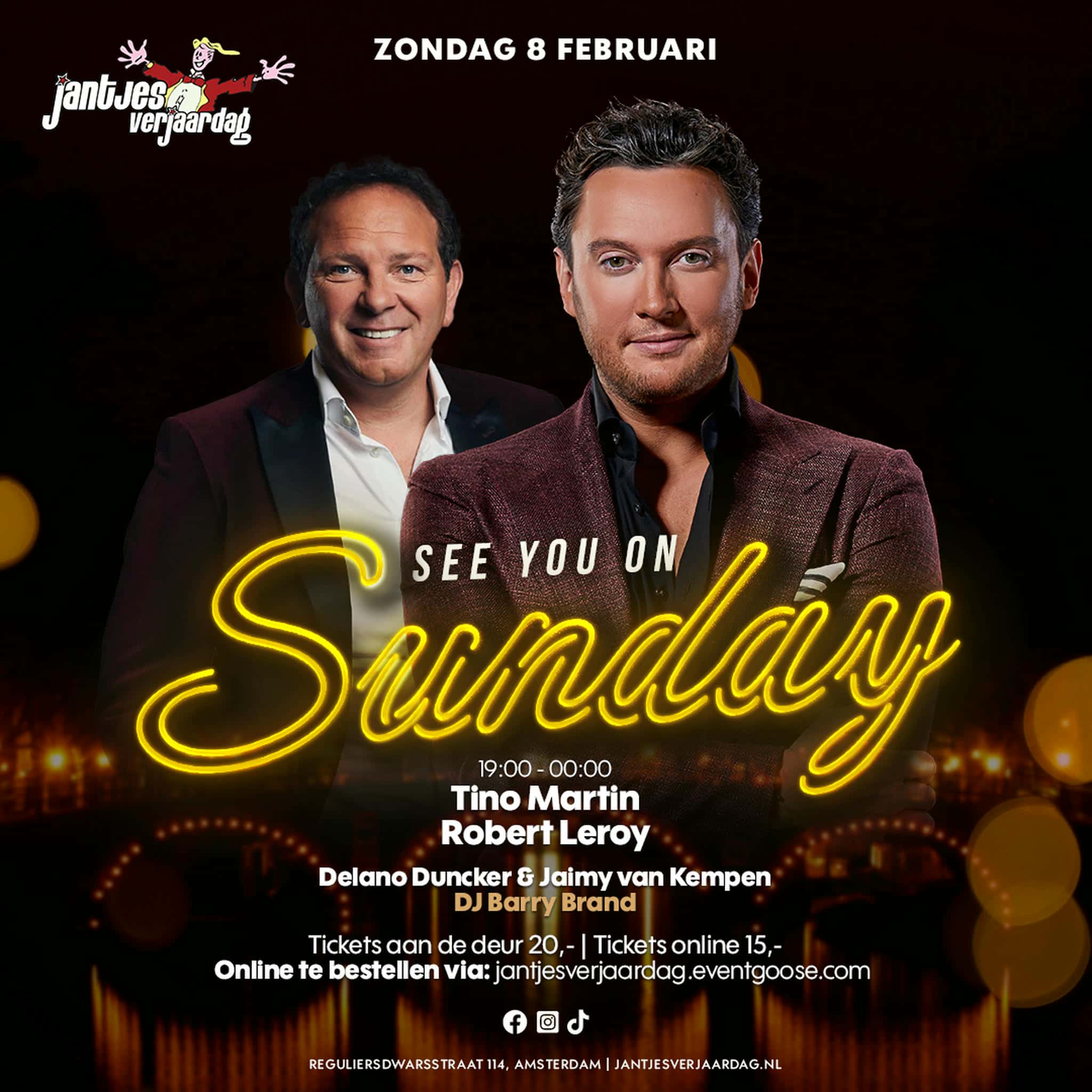 Jantjes Verjaardag presenteert: See you on Sunday met heerlijke feestartiesten, top-dj’s, gratis entree. Hollandse meezingers & ouderwetse gezelligheid. See you on Sunday!